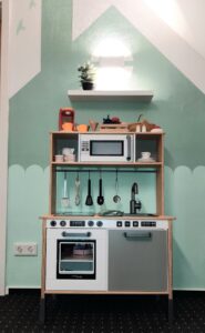 Die Betreuung ihrer Kinder findet in unseren privaten Räumlichkeiten in Fürstenberg statt. Ein ca. 20 m² heller, eigens für die Kindertagespflege eingerichteter großer Raum im 1. Obergeschoss, dient als Gruppen-, Spiel- und Schlafraum. Dieser Raum ist ausgestattet mit einer Lese- und Kuschelecke, einer Spielküche und Platz zum freien Spielen, wobei ich darauf achte, dass die Spielsachen möglichst sinnbringend und hochwertig sind. Auf beiden Wohnebenen befinden sich jeweils ein Bad mit Toilette (Sitzverkleinerung / Töpfchen), Waschbecken (mit Hocker) und Dusche. Die Mahlzeiten nehmen wir gemeinsam an einem Tisch in Kleinkindhöhe mit passenden Wendehockern ein.