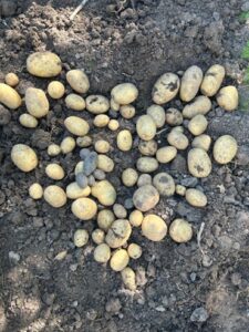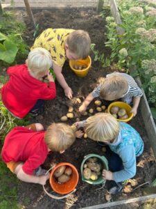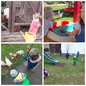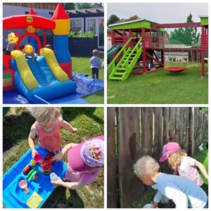 Im großen Garten und in der Scheune gibt es viel zu entdecken: Wir versorgen unsere acht Hühner, bauen Sandburgen, erkunden das Spielhaus und fahren mit Bobbycars, Laufrädern und Trampeltreckern umher.