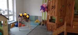 Ein besonderer Bestandteil meiner Kindertagespflege ist die eigene Hochebene, die die Bewegung der Kinder fördert und die Entwicklung ihrer Motorik unterstützt. Über eine kleine Treppe gelangen die Kinder auf die zweite Ebene, über eine Rutsche wieder nach unten. Im Inneren befindet sich eine Spielküche; oben lädt eine kuschelige Lese- und Rückzugsecke zum Ausruhen, Spielen, Krabbeln und Verstecken ein.