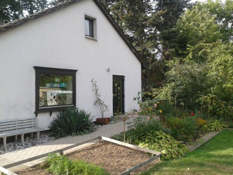 Ein großzügiges Außengelände: Ein eingezäunter Garten bietet Platz zum Austoben, Spielen, Experimentieren und Erforschen der Natur. Hier gibt es auch ein Gemüsebeet, Blumenbeet und verschiedene Beerensträucher. Alles, was kriecht und krabbelt, wird genaustens untersucht.